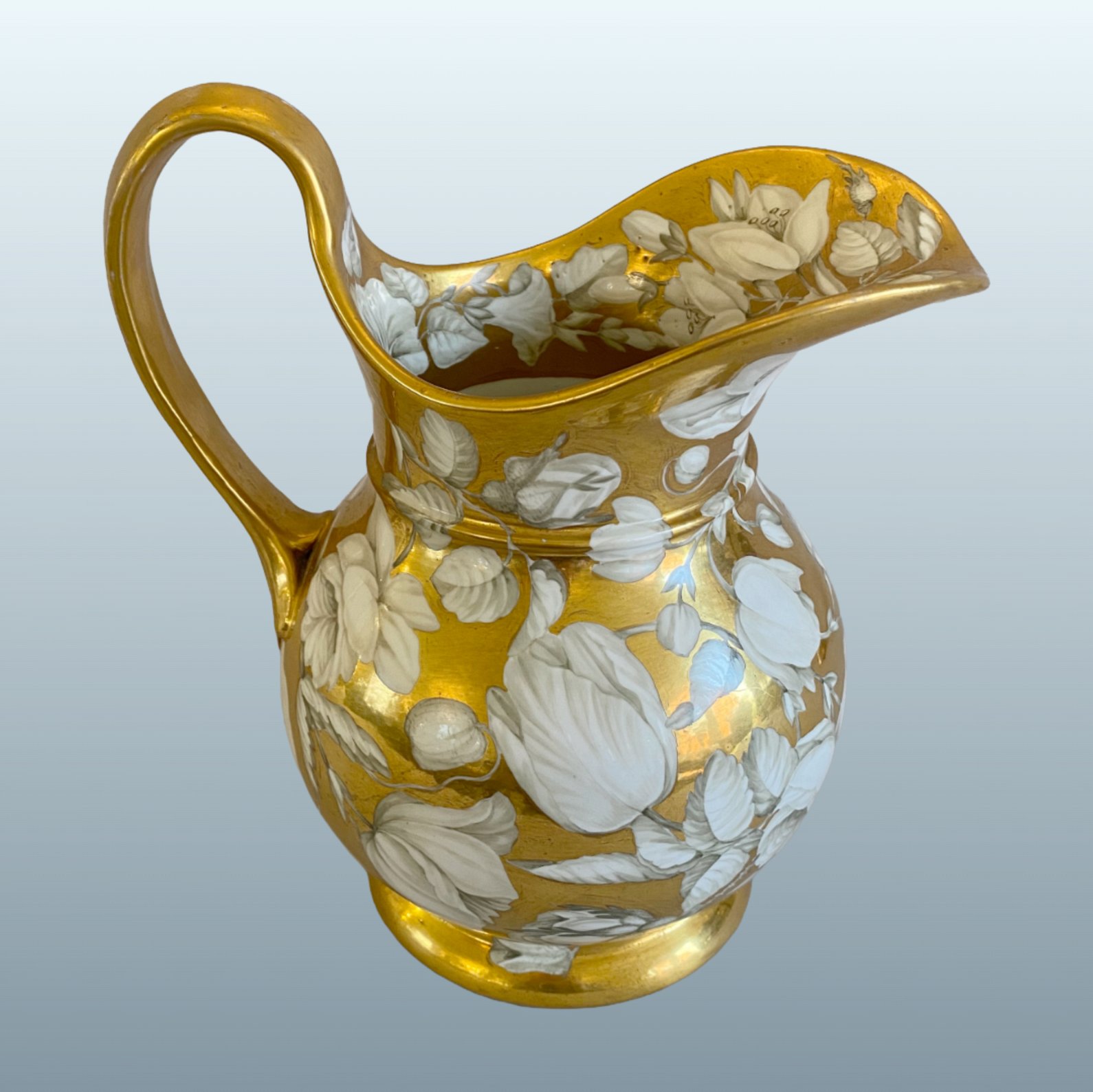 Of impressive scale and bellied form, profusely decorated with an abundant arrangement of white flowers— including roses, lilies and tulips—delicately heightened with monochrome detailing and reserved against a richly burnished gilt ground. The decoration continues unusually within the inner rim, demonstrating a high level of finish and attention to detail.