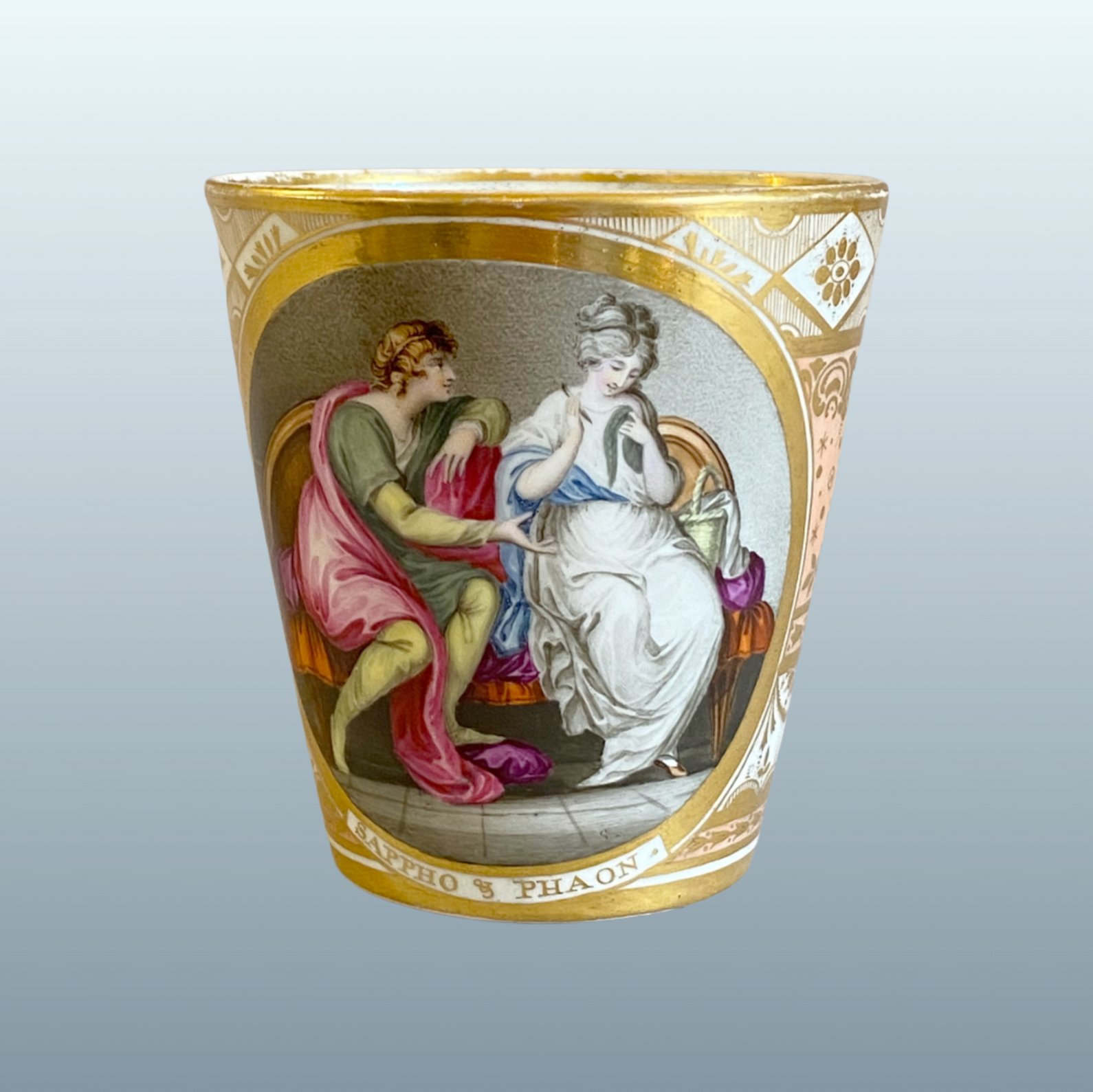 Of inverted truncated-cone form, finely painted in polychrome with the classical subject of Sappho and Phaon within an oval reserve to the front, the title inscribed beneath. The scene is derived from an engraving after Angelica Kauffman, published in 1794, and executed by Thomas Baxter, one of the factory’s most accomplished artists. The reverse with elegant neoclassical gilt decoration comprising rosettes and stars set against a wide pale salmon ground, with a band of gilt lozenges above and pendant festoons below, all finely tooled in gold.