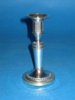 Description: An unusual George III Round Shaped Taper Stick, circa 1780. The plain tapering circular stem with beaded borders, harebell and vertical panelled capital, circular drip pan sconce with floral border, on a raised circular foot with leaf and bead borders. A9960.
