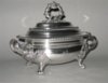 A GOOD SINGLE REGENCY PERIOD OLD SHEFFIELD PLATE SILVER SAUCE TUREEN & COVER. GEORGE III, C. 1815 Made by Creswick. Of oval form with four cast leaf feet and engraved crest.