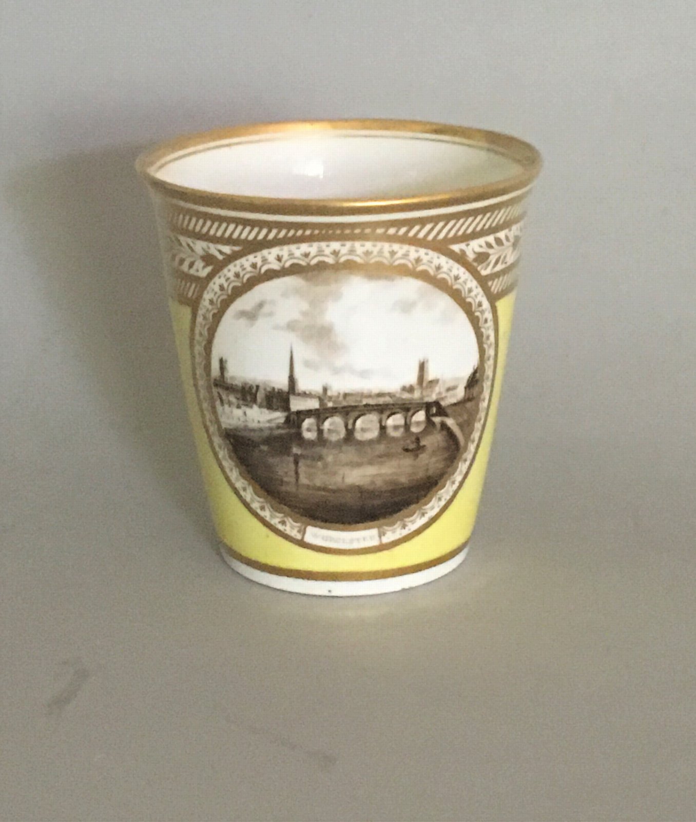 A FINE CHAMBERLAINS WORCESTER PORCELAIN BEAKER, CIRCA 1800. Having a gilt bordered central panel with a painted monochrome scene of Worcester, reserved on a yellow ground. Provenance: With Manheim, New York.