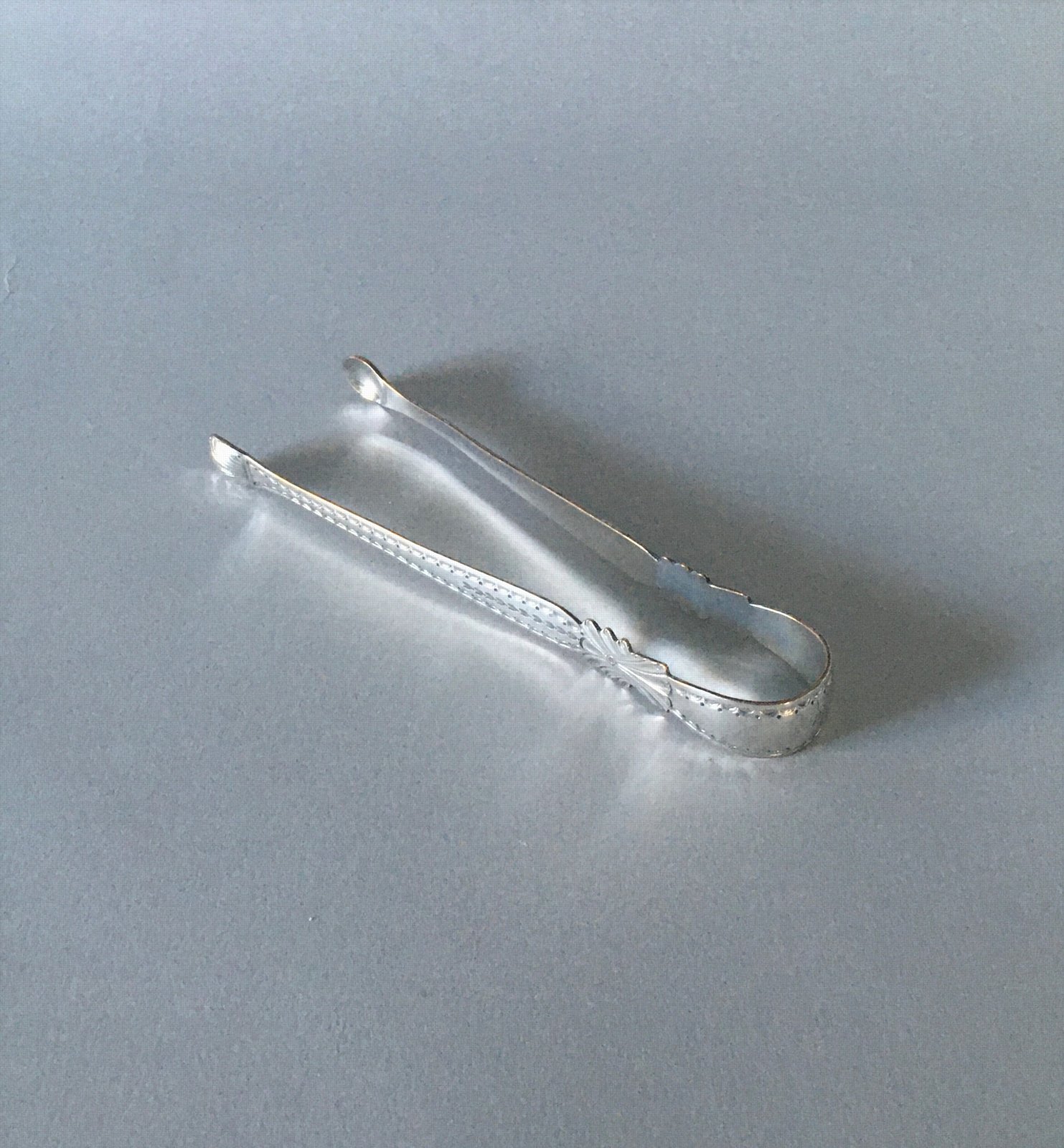 A GOOD PAIR OF 18TH CENTURY OLD SHEFFIELD PLATE SILVER SUGAR TONGS 1770-1780 Excellent condition with shell bowls, script initials to the end and with lovely engraved delicate decoration. Length: 5.5 inches.