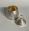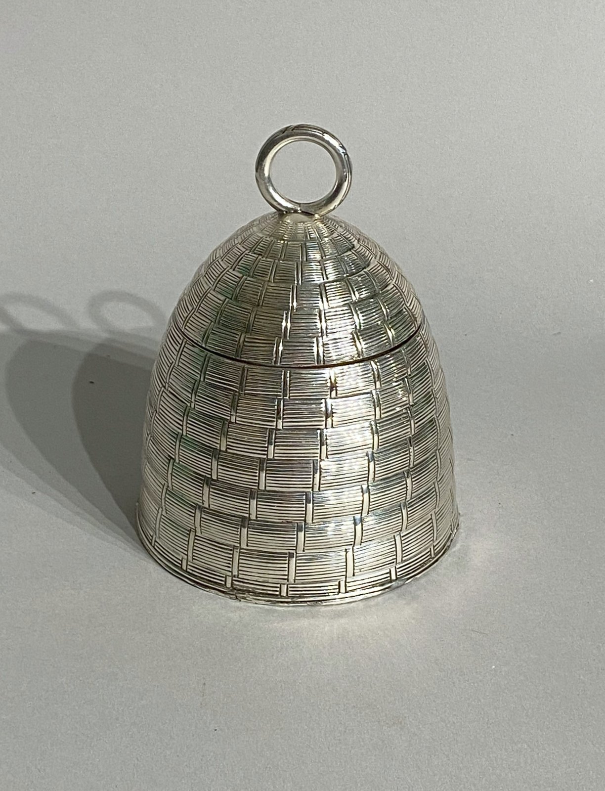 In the form of a beehive with a loop handle and removable cover. The inside retaining its original gilding.