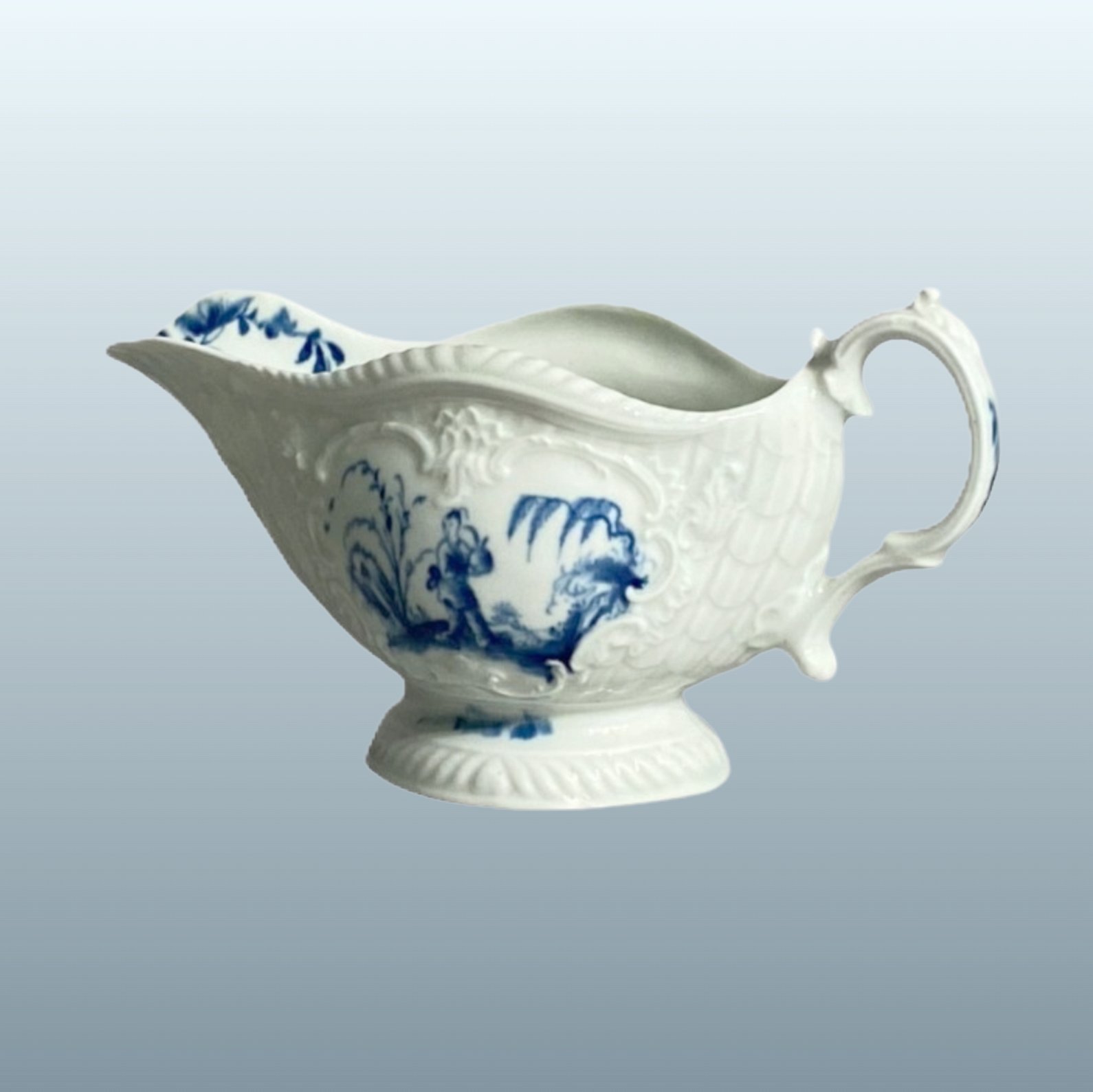 18TH CENTURY CAUGHLEY PORCELAIN BLUE & WHITE SAUCE BOAT. Moulded, fluted and underglaze blue printed Chinoiserie scene. Crescent mark under. 7in.