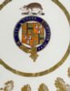 Each with a wide gilt Greek Key border upon a deep cobalt blue ground, a band of gilt oak leaves within and centred with a full colour armorial within a garter and a badger crest. Diam: 8.25in. Motto: Vis Unita Fortior (United strength is stronger)