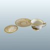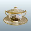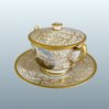 A FINE FLIGHT BARR & BARR WORCESTER PORCELAIN TWO HANDLED CUP, COVER AND STAND. CIRCA 1820. The cup beautifully painted with a named scene of Bothal Castle, Northumberland reserved upon a continuous seaweed gilt pattern, which is continued on the cover and stand and bordered with gilt bands.  Makers impressed mark & in red script: Flight Barr & Barr, Royal Porcelain Works Worcester- London House, No:1 Coventry St. Height: 3.75 inches