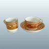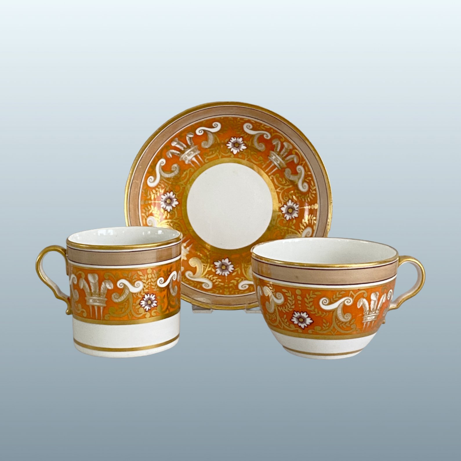 A FINE SPODE PORCELAIN TRIO, CIRCA 1815. A fine trio comprising a coffee can, teacup, and saucer, decorated with a wide orange ground and enhanced with gilt neoclassical ornament. Each piece is further enriched with the Prince of Wales feathers motif, a mark of regal elegance and fashionable taste. The combination of vibrant colour, meticulous gilding, and iconic heraldic imagery exemplifies Spode’s mastery in producing visually striking yet refined porcelain for tea and coffee service.