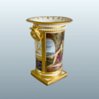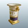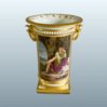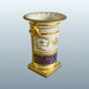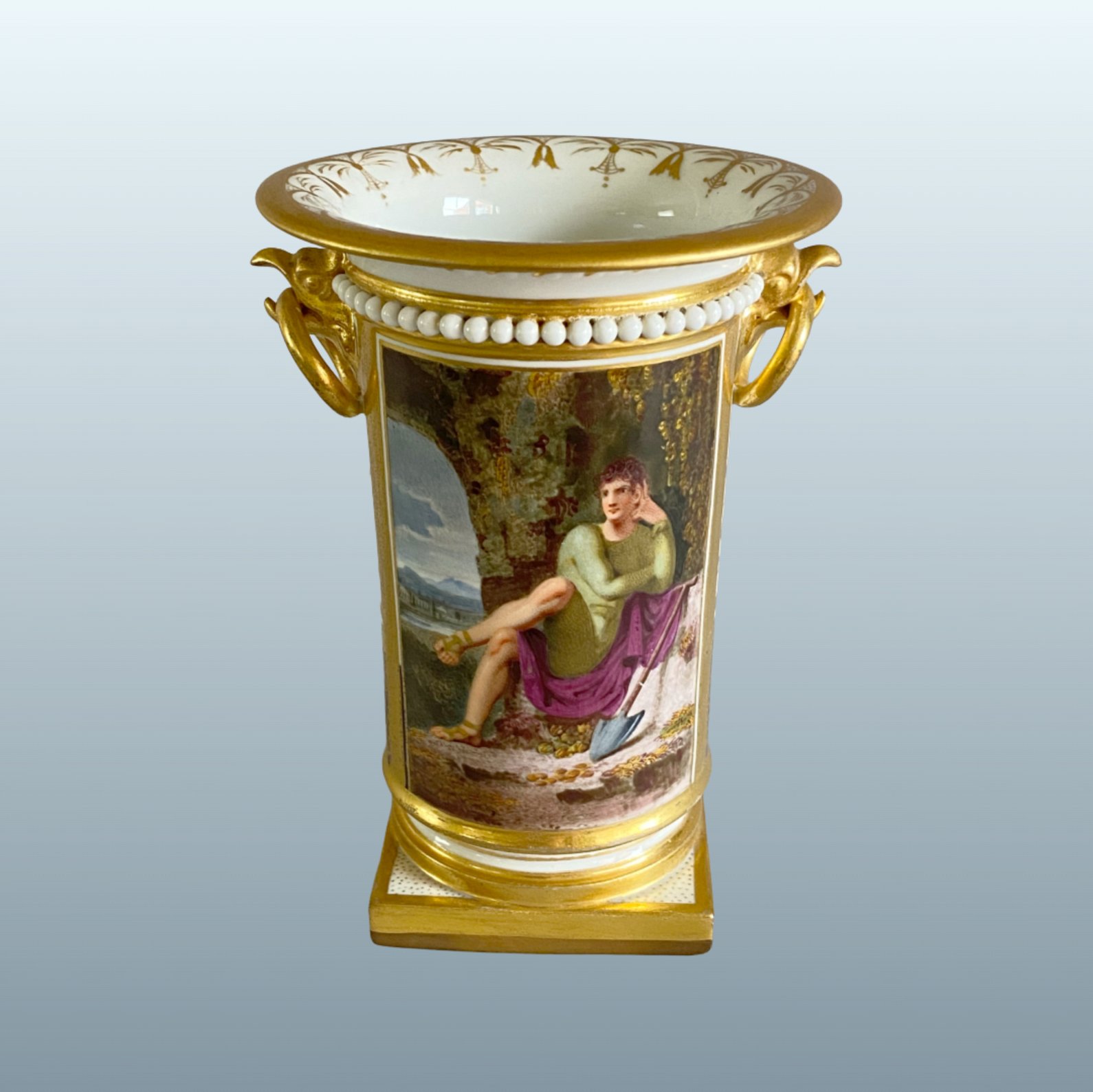 An elegant and highly decorative early 19th-century Flight Barr & Barr spill vase, with a cylindrical body rising from a square plinth base to a gently flared rim, & white beaded collar & distinctive gilt bird’s head and ring handles. The body is centred with a finely painted full-length portrait panel depicting a contemplative male figure set within a landscape, inspired by Timon from Timon of Athens. An inscription reads: “Timon: Let me look back at thee,” referencing the character’s introspective and tragic narrative. The reverse is richly decorated with gilded neoclassical motifs reserved upon a deep blue & marbled ground, providing a striking contrast to the figural panel and further enhancing the vase’s opulent appearance. Full marks under referencing Flight & Barr’s Royal patronage. H: 5.25in