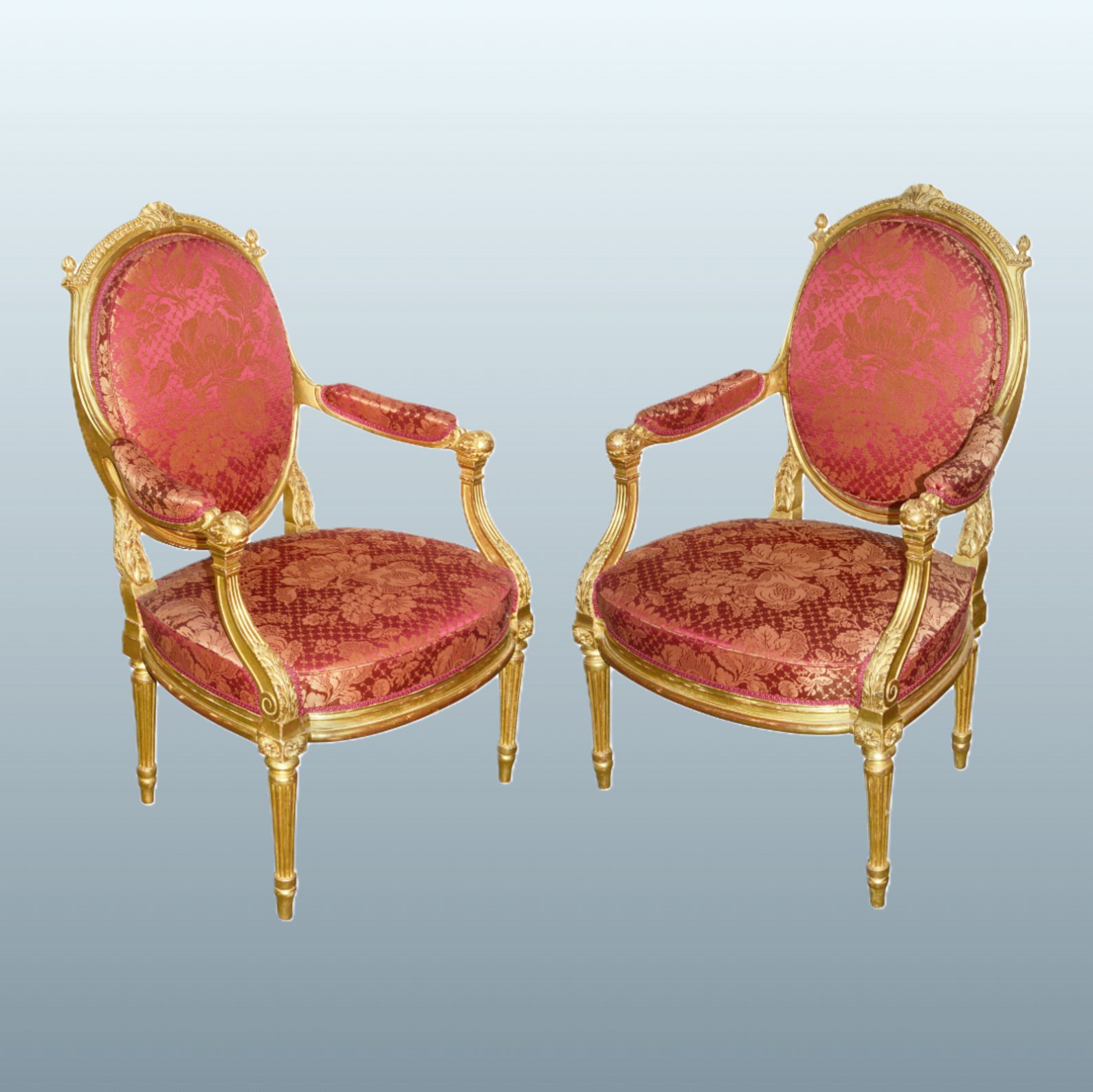 With oval upholstered panel backs on foliate uprights with bowed stuffed seats and padded splayed arm supports on fluted tapered legs headed with paterae. Damask silk upholstery. The foliate carving on the curved uprights supporting the backs are a feature of chairs from the workshop of John Linnell.