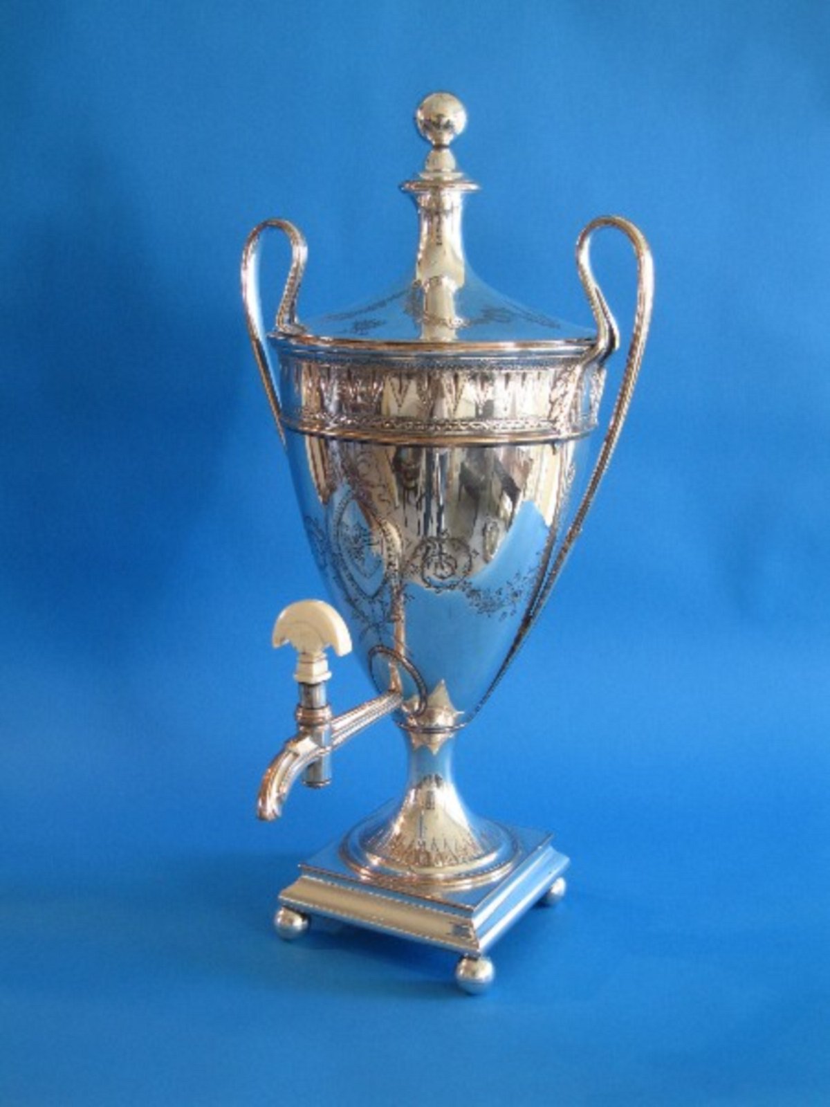 Description: A fine late 18th Century Old Sheffield Plate tea urn, in the Adam style, the crested lid above a scolled two handled body in a classical vase shape, raised on a square base with ball feet. The whole chased with floral swags and geometric patterns and with a sheild armorial within a floral cartouche to the front. George IV circa 1785. Complete interior.