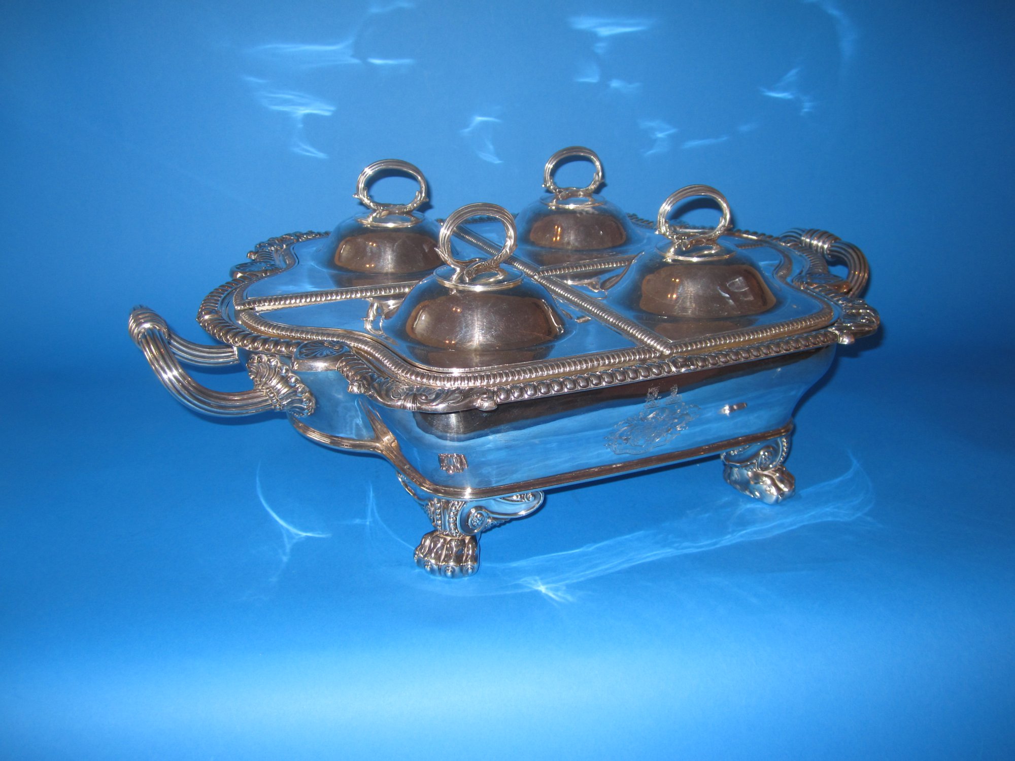 Description: A remarkable Old Sheffield supper dish in virtually unused original condition. Of oblong form with four separate & removale lidded dishes over a hot water base and raised on superb lions paw feet. Engraved with the crest & motto of the Wellesley family, porro unum est necessarium (moreover, one thing is needful).George IV circa 1825