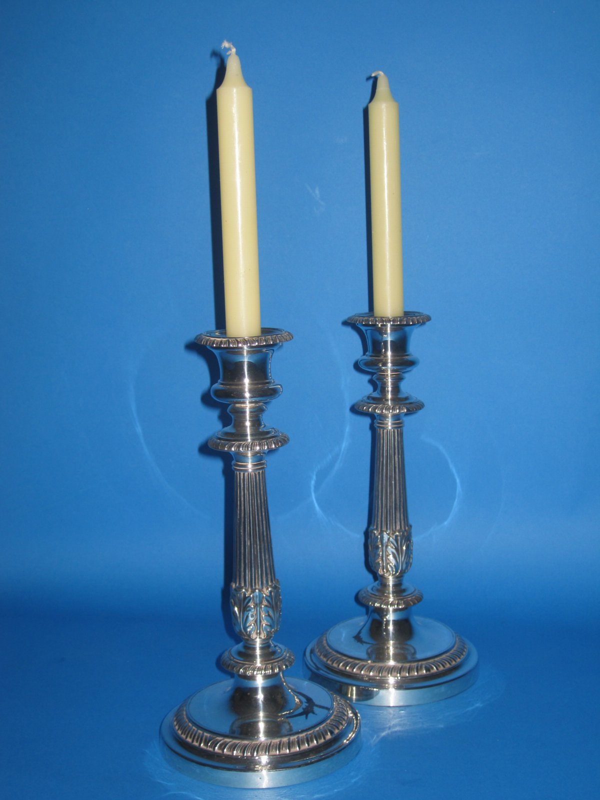 Description: A good pair of Mathew Boulton Old Sheffield plate silver candlesticks. Round gadrooned bases with acanthus leaf & fluted columns with gadrooned collars and sconces.