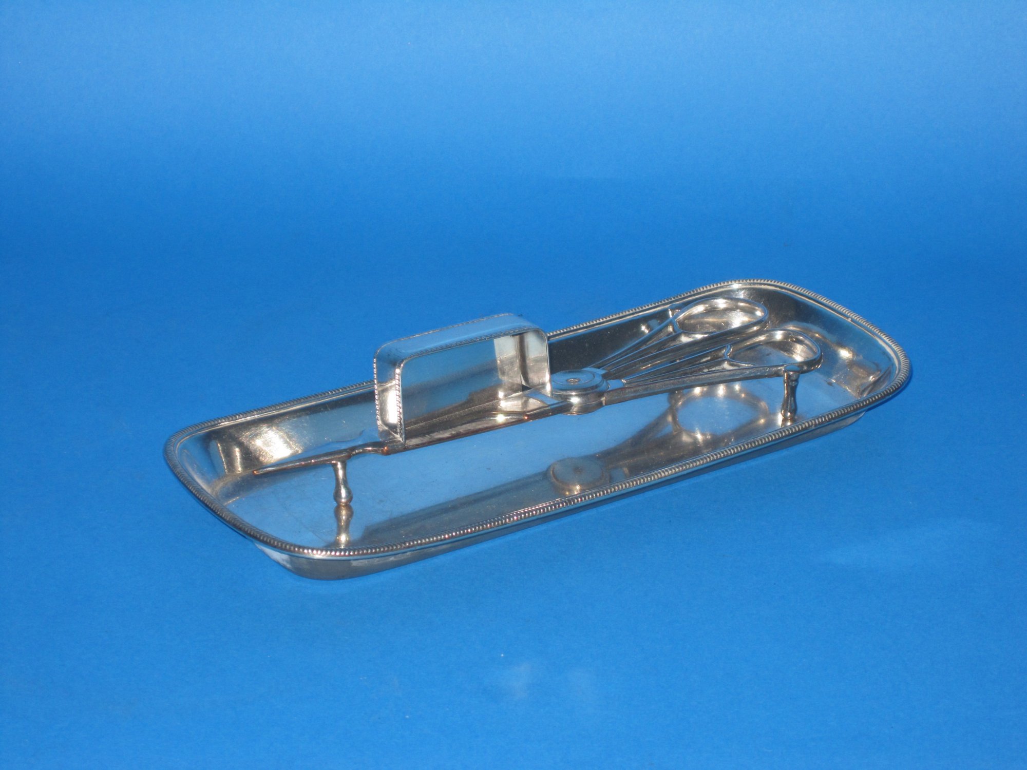 Description: A complete Old Sheffield plate silver candle snuffer & tray. Of simple oblong form with small beaded border decoration. George III circa 1790.